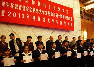 颁奖大会上,曾宪梓以亲身经历勉励老员工艰苦奋斗创业,勤俭诚信做人,终身报效祖国。曾宪梓动情地对获奖同学说:“我过去也是穷孩子,但是依靠党和国家给予的助学金,我念完了中学和大学,并把成长中的困难当作前进的动力。现在,我拿出的只是一点点微不足道的帮助,但是很多同学给我写信,表达报效祖国的念头让我很感动。”