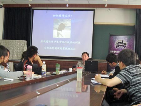 紧接着,陈老师结合案例分析着重指出了,同学们在应对压力时应如何进行自我调节的三种有针对性的方式和途径。首先,在面对压力时,我们主观上应该要勇敢的面对,进行理性思考,明确目标并不断地调整对压力的认识;另外,她指出同学们面对压力时还应该注意进行生理调节和行为调节。总之,通过主客观方面的努力,从容对待生活中的压力和挫折,变压力为动力,从而促进自身素质的提高。她还指出,同学们在将来社会激烈的竞争中必定面对许多的压力,然而理性的面对压力并学会自我调适是一个人通往成功的必备的素质。