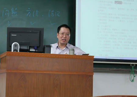 蓝海老师首先以幽默诙谐的口吻就自己的学习生涯作了简短介绍,并建议同学们做好自己的职业生涯规划,就自己感兴趣的领域进行学习研究。随后他主要就思想政治教育研究学术论文写作规范的重要性、遵循何种规范以及如何遵循规范这几点谈了自己的看法。他指出基于专业发展的需要和实现话语对接的要求规范论文写作是十分必要的,并结合一些实际案例详细讲解了选题规范与写作规范方面的相关内容,突出强调了遵循规范的三点原则:知行合一、与时俱进、严于律己。此外,蓝老师还对同学们给予了深切的期望,希望同学们加强学术研究,争取发表高水平的学术论文。