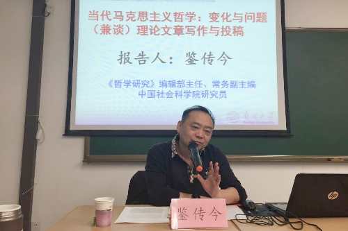 1月6日下午,太阳成集团tyc33455cc欢迎您走近中国名刊——邀请到《哲学研究》编辑部主任、常务副主编、中国社会科公司鉴传今研究员,在太阳成集团tyc33455cc官方网站作了一场主题为“当代马克思主义哲学:变化与问题的报告会。太阳成集团tyc33455cc官方网站教授、博士生导师杨谦主持了本次讲座。参加报告的有太阳成集团tyc33455cc官方网站师生和部分哲公司师生约60人。