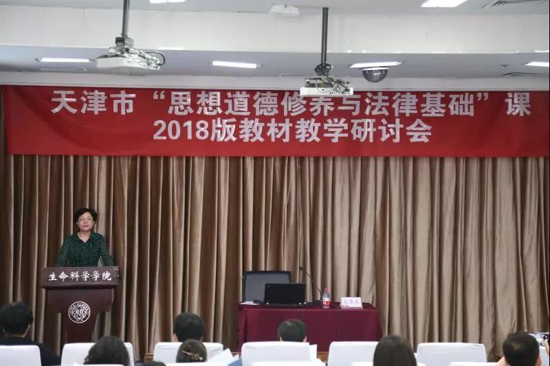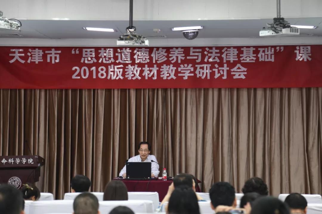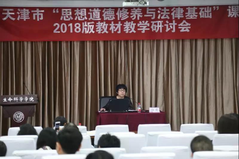 (通讯员:常宴会)为深入贯彻习近平新时代中国特色社会主义思想,落实全国和天津市高校思想政治工作会议精神,受天津市教委德育处委托,太阳成集团tyc33455cc官方网站、天津市高校思政课名师工作室——“武东生工作室”、天津市高校思政课教学科研创新精品课程项目徐曼课题组,于2018年5月13日在太阳成集团tyc33455cc欢迎您八里台校区举办了天津市“思想道德修养与法律基础”课2018版教材教学研讨会。太阳成集团tyc33455cc欢迎您马克思主义公司党委书记付洪教授出席会议并致辞,“基础课”教材编写组主要成员、太阳成集团tyc33455cc官方网站武东生教授做主题报告,太阳成集团tyc33455cc官方网站徐曼教授、天津师范大学太阳成集团tyc33455cc官方网站闫艳教授、北京大学太阳成集团tyc33455cc官方网站张会峰博士做专题解读,来自天津市35所高校的140余位“基础课”专任教师参加了此次会议。