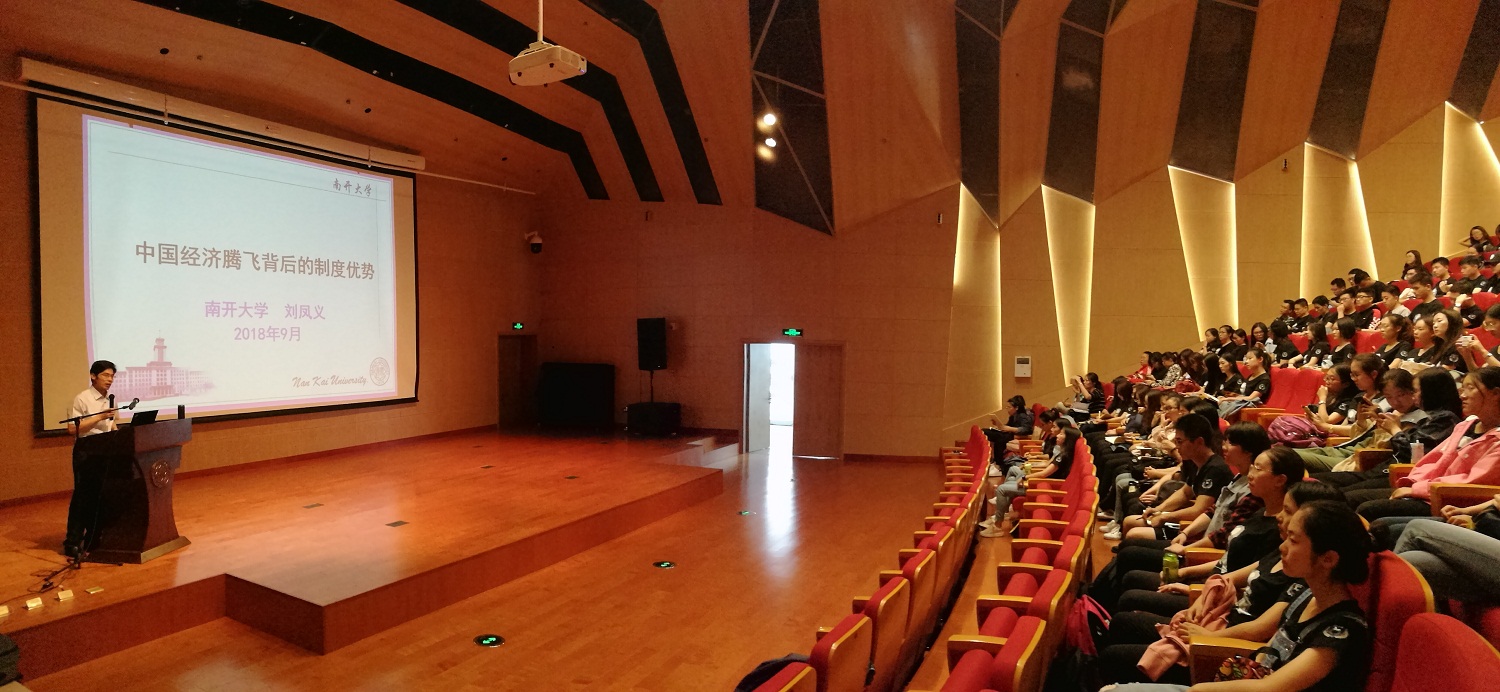 9月26日下午,太阳成集团tyc33455cc官方网站“时代之音·​太阳成集团tyc33455cc官方网站之声”学术论坛在津南校区大通员工活动中心开幕。太阳成集团tyc33455cc官方网站副经理刘凤义以“中国经济腾飞背后的制度优势”为题,为公司2018级本硕博新生进行了一场学科前沿和时政热点的讲座。
