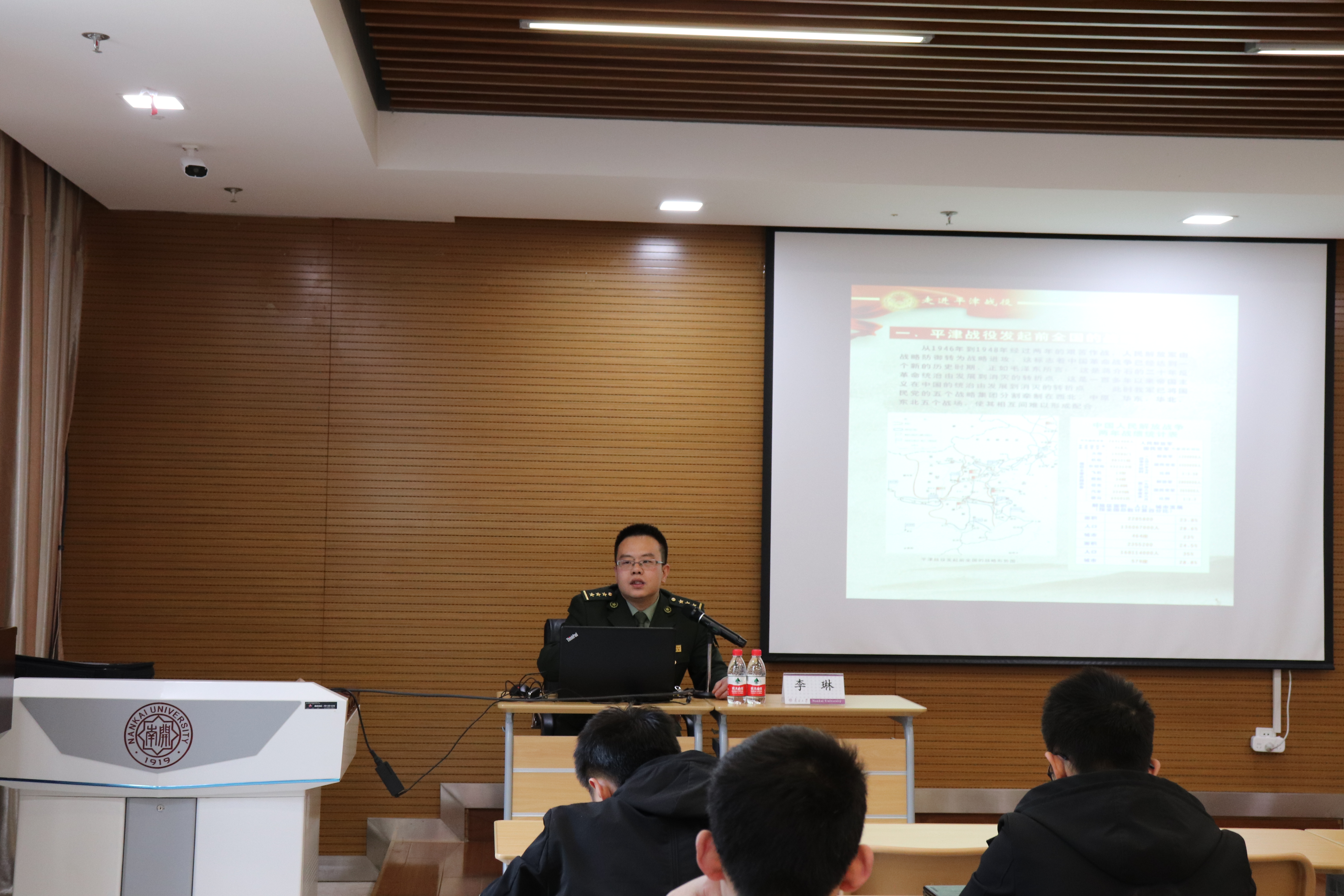 李琳以讲故事的方式带大家走进平津战役,回顾革命历史,领略战争年代革命英烈大无畏的英雄气概。讲座伊始,李琳引导同学们思考,解放战争前中国共产党只有120万兵力,掌握根据地面积、人口不足全国30%,在既没有外力支援,自身力量又很弱小的情况下何以取得战争胜利,为共和国定都北京奠基?他强调,正是因为有无数为了革命理想不惜抛头颅洒热血的英雄们,革命才取得了最终的胜利。在新保安战役中,面临九死一生的严峻形势,“尖刀部队,党员先上”是每一位党员的共识,党员的使命和责任在战争时期体现的淋漓尽致,是坚定的信仰支撑起革命烈士前进的动力。