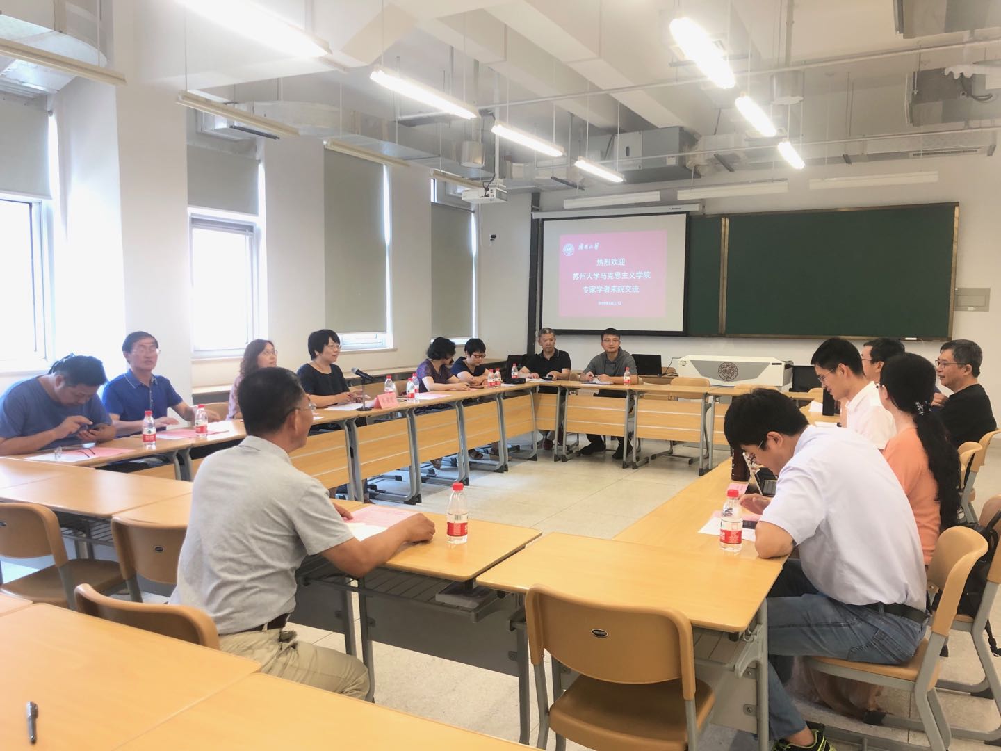 6月27日上午,苏州大学太阳成集团tyc33455cc官方网站副经理朱蓉蓉、马克思主义基本原理概论教研室主任范俊玉、副主任李莉一行9人来公司交流考察。公司副经理孙寿涛、马克思主义基本原理概论教研室主任陈弘、马克思主义基本原理概论教研室吴克峰、刘明明、石镇平、叶冬娜、竟辉等老师参加了座谈交流。