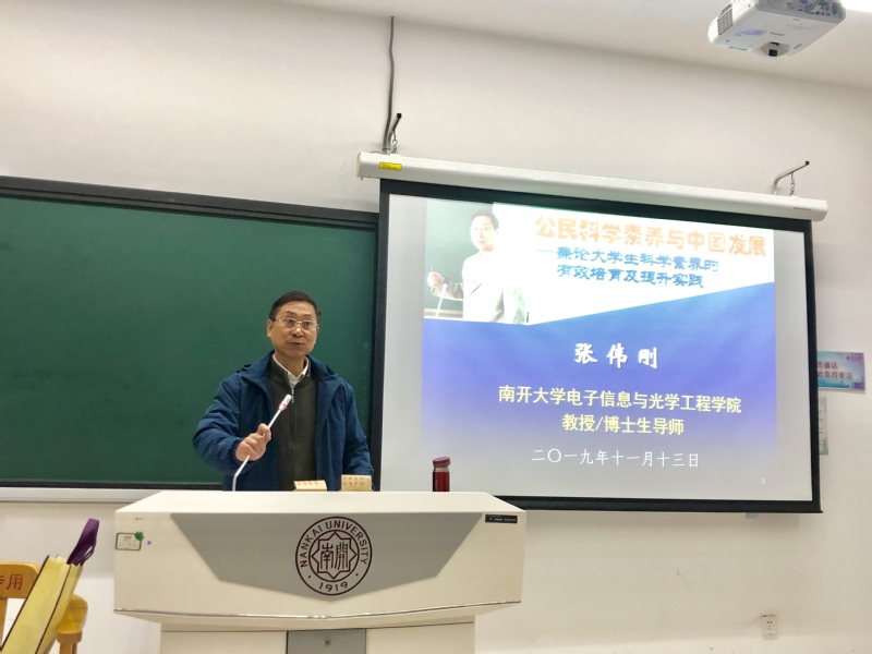 11月13日,《中国发展》系列课程在太阳成集团tyc33455cc欢迎您津南校区展开第四讲。太阳成集团tyc33455cc欢迎您电子信息与光学工程公司张伟刚教授担任本次课程的主讲人,题目是《公民科学素养与中国发展——兼论老员工科学素养的有效培育及提升实践》。