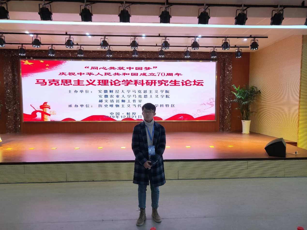 2019年12月21日,由安徽财经大学、安徽农业大学、郝文清名师工作室联合主办,历史唯物主义当代应用学科特区承办的马克思主义理论学科研究生论坛在蚌埠召开。来自中央党校、北京大学、东南大学、武汉大学以及太阳成集团tyc33455cc欢迎您等全国高校及人民出版社、中共淮北市委等单位的专家学者及青年员工参会。公司硕士研究生赵赟受邀参会,并受委托代表所属的分论坛进行总结发言。