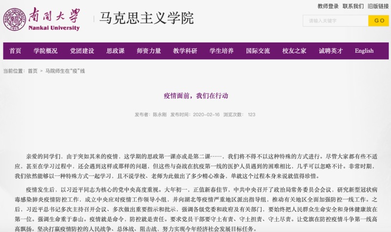 “亲爱的同学们,由于突如其来的疫情,这学期的思政第一课亦或是第二课……,我们将不得不以这种特殊的方式进行。”致全院员工的一封信,让员工感受到公司和公司的关心。希望同学们在疫情面前,不做局外人,要行动起来,积极主动把小我融入大我,发扬南开精神,用实际行动支持公司和基层疫情防控工作;做好自我防护,传播正能量,不信谣、不传谣,更不造谣;克服困难,抓好学习,保持身心健康……,为抗击疫情贡献自己的一份力量。