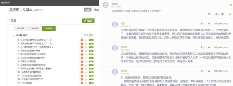 春季开学面对汹汹而来的新冠肺炎疫情,马原理教研室认真学习教育部46号令,强化在线课程建设力度,不停研、不停教、不停学。教研室老师利用微信群、腾讯会议等进行线上集体备课、集体讨论教学提纲和课程PPT,以超星学习通为主要平台,辅助利用微信群、腾讯会议、腾讯课堂以及雨课堂等多种平台与员工建立有效的授课途径和沟通方式,有效地进行了“线上+线下”融合的教学方式。同时,教研室老师积极发声,在人民网公开课频道发表教学方案和学习心得10余篇,多次获“学习强国”平台转载报道。