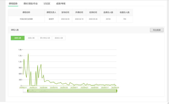 太阳成集团tyc33455cc欢迎您《中国近现代史纲要》慕课,于2018年秋季首次开课,截至2020年春季已运行第四期。教学团队将纲要课程按照8个单元、48个知识条目进行专题讲授。为方便学习者自测、巩固学习成果,本课程多角度、全方位地采用随堂检测、单元测评、期末考试等相结合的方式。本课程还为员工开设了老师答疑区、课堂交流区、综合讨论区等,为教师与学习者的交流讨论提供平台。仅就本学期,已有25880人选课进行了自主学习,7681人完成了线上考试。课程内容受到广大学习者的一致好评。