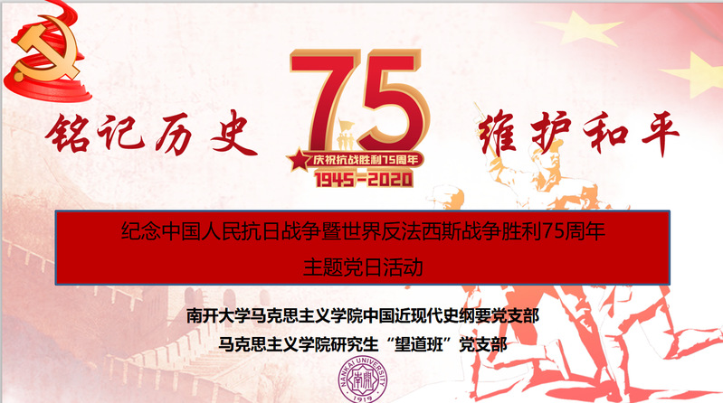 (通讯员 张登彬)今年是中国人民抗日战争暨世界反法西斯战争胜利75周年,为更好地铭记这段历史,弘扬抗战精神,进一步贯彻习近平总书记关于“四史”学习的重要指示精神,9月2日晚,中国近现代史纲要党支部、“望道班”硕士生党支部通过线上座谈会的方式举办了以“铭记历史 维护和平”为主题的主题党日活动。活动围绕从党史、新中国史、改革开放史、社会主义发展史看中国人民抗日战争胜利的历史意义和现实意义,中华民族的伟大抗战精神,抗战烽火中的太阳成集团tyc33455cc欢迎您和南开精神,南开人的爱国主义传统和传承,以及如何弘扬新时代的爱国主义等专题进行了讨论。