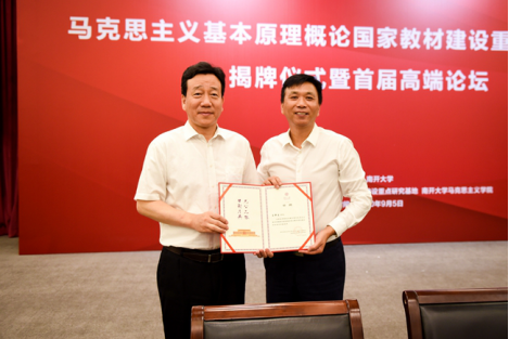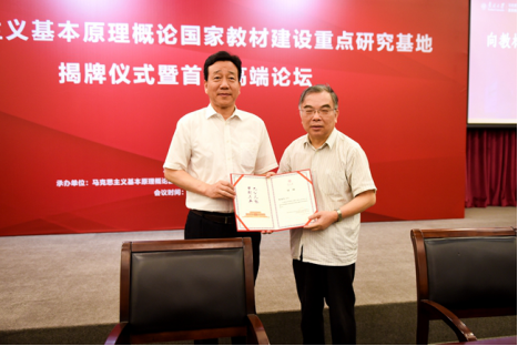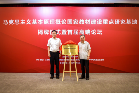 9月5日,“高校思想政治理论课马克思主义基本原理概论国家教材建设重点研究基地”揭牌仪式暨首届高端论坛在太阳成集团tyc33455cc欢迎您举行。太阳成集团tyc33455cc欢迎您党委书记杨庆山,毛泽东思想和中国特色社会主义理论体系概论国家教材建设重点研究基地主任、北京大学博雅讲席教授顾海良应邀共同为基地揭牌。太阳成集团tyc33455cc欢迎您副董事长王新生主持揭牌仪式。