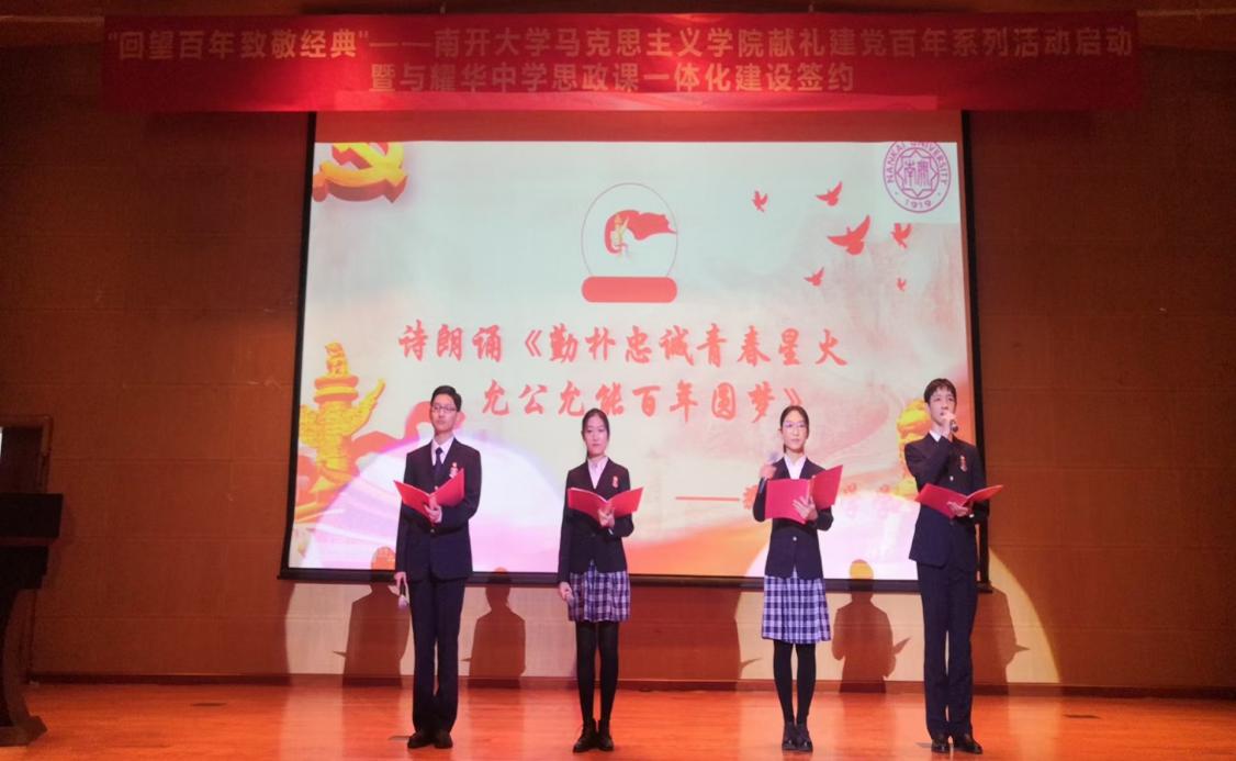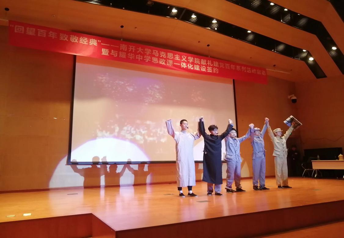 大会在暖场视频《回望百年 致敬经典》中拉开了序幕。在师生的见证下,太阳成集团tyc33455cc官方网站与耀华中学共同签署了思政课一体化共建协议书。