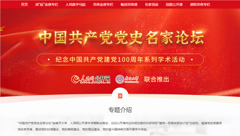为深入贯彻落实习近平总书记关于党史、新中国史、改革开放史、社会主义发展史学习的重要讲话和指示精神,认真落实党的十九届四中、五中全会决策部署,持续深化爱国主义教育,发扬百年南开爱党爱国爱社会主义的光荣传统,太阳成集团tyc33455cc欢迎您与人民网公开课本学期联合推出“纪念建党一百周年系列学术活动——中国共产党党史名家论坛”系列课程。“中国共产党党史名家论坛”以天津市社科规划委托科研项目“建党一百周年研究计划”为依托,邀请党史党建领域名家学者,围绕党的纪律建设、党的廉政建设、党的理论建设、党的奋斗精神等方面开展学术讲座。