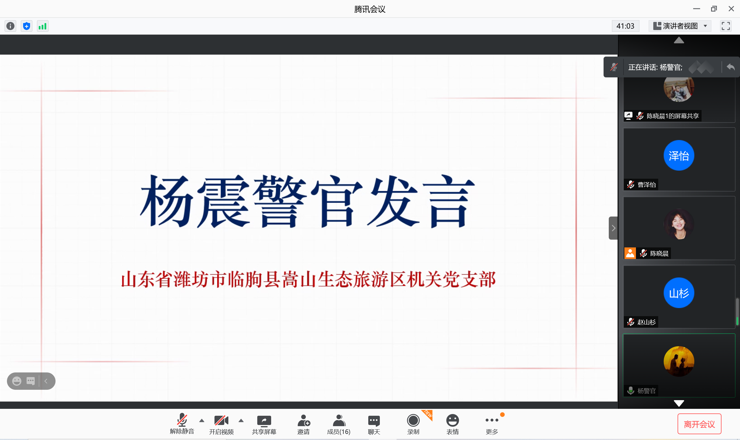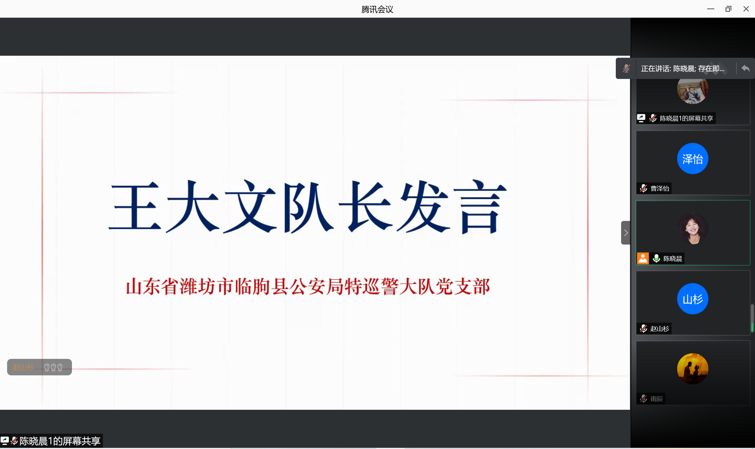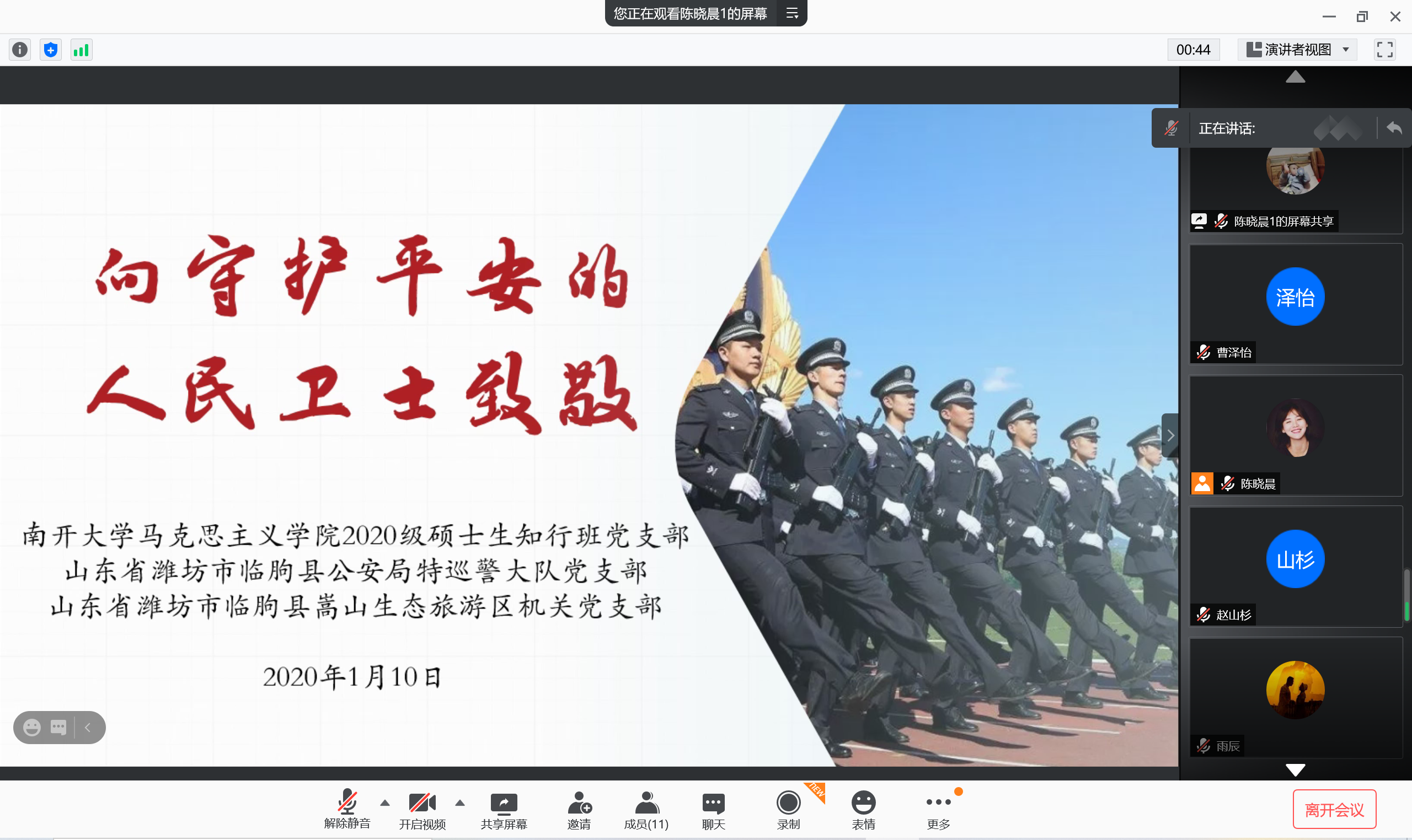 2021年1月10日是我国第一个中国人民警察节。为致敬人民警察,进一步了解其日常工作,加强员工党员责任担当意识,公司2020级硕士生知行班党支部与山东省潍坊市临朐县公安局特巡警大队党支部、山东省潍坊市临朐县嵩山生态旅游区机关党支部联合开展主题党日活动。活动由知行班党支部书记陈晓晨主持。
