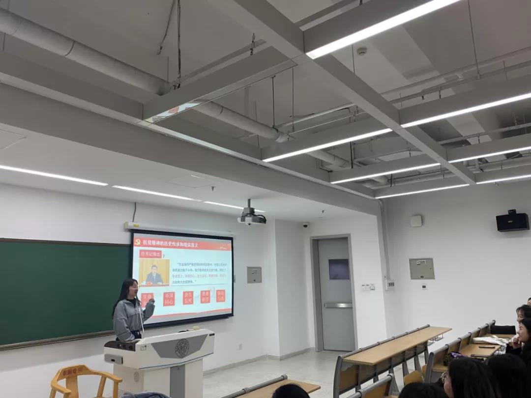 会议伊始,全体成员合唱团歌。随后团支部书记殷辉敏以“弘扬新时代伟大‘抗疫精神’”为主题,讲述了一堂生动的团课。殷辉敏从“抗疫精神的历史传承和现实意义”、“新时代抗疫精神的丰富内涵”、“新时代抗疫精神的历史意义”三个方面给大家讲述了“抗疫精神”,并号召大家在新时代学习并弘扬“抗疫精神”,坚定理想信念,努力抒写人生华章,担当新时代的责任。