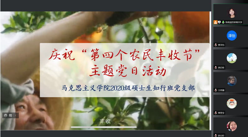 为庆祝第四个农民丰收节,增进支部党员对我国农业发展政策与现状的了解,2021年9月23日,2020级硕士生知行班党支部围绕“三农”问题在线开展了主题党日活动。党支部书记陈晓晨主持会议,支部全体党员参加。