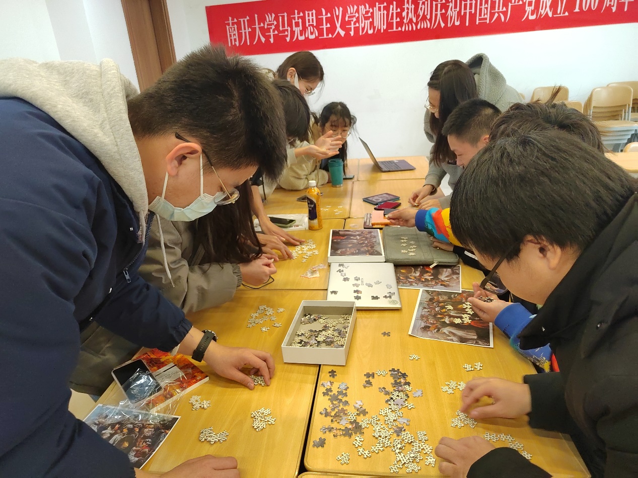 拼图由红色题材油画定制而成。团小组拿到各自的拼图后,开始了紧张而有序的拼图环节,团小组成员合理分工、相互合作。“四次方程”团小组首先完成拼图,用时35分钟。先完成的团小组成员积极帮助其他团小组。经过一个多小时,各小组均完成了拼图任务。每个团小组派出一名同学讲述拼图反映的历史事件或历史主题,大家在同学们的讲述中回顾了“一二·九”员工运动、遵义会议的红色历史,重温了长征、抗日战争反映的革命精神,感悟了军民鱼水情。