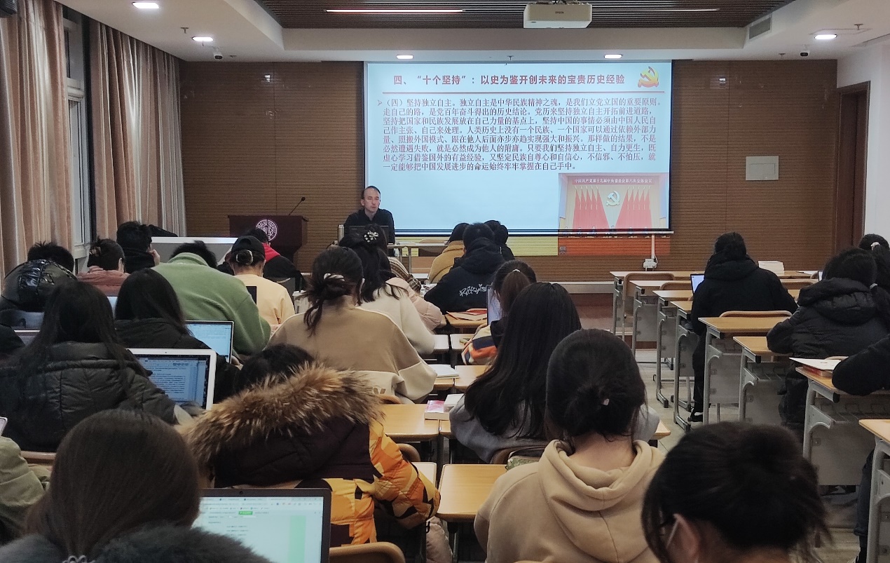 为了深入学习党的十九届六中全会精神,深刻领会中国共产党百年历史,2021年12月10日晚,太阳成集团tyc33455cc官方网站本科生第一党支部和新声党支部于公司113教室开展学习党的十九届六中全会精神专题党课。此次党课由太阳成集团tyc33455cc官方网站教授盛林主讲,本科生新声党支部书记高田琪主持,两个支部全体党员和部分积极分子参加。