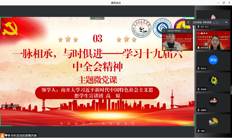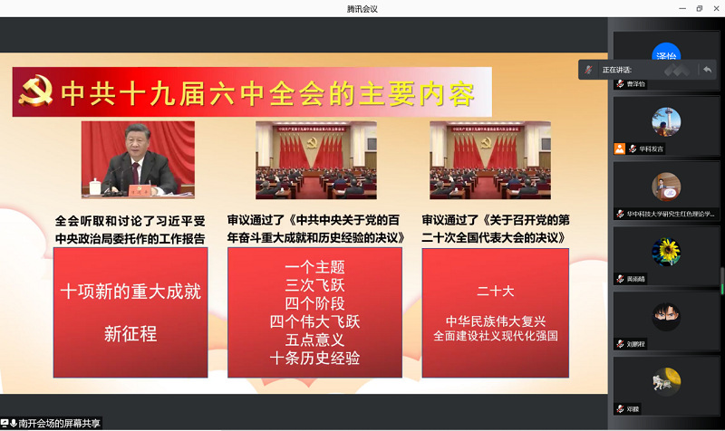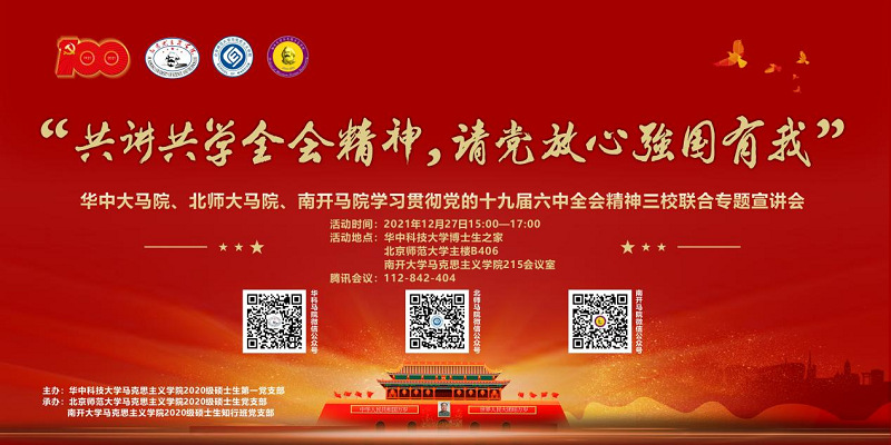 为深入学习贯彻党的十九届六中全会精神,落实习近平总书记关于“党史学习教育”的重要指示,深化“不忘初心、牢记使命”主题教育成果,传承红色基因、发扬红色精神、砥砺政治品格,2021年12月27日,太阳成集团tyc33455cc欢迎您、北京师范大学、华中科技大学三校太阳成集团tyc33455cc官方网站研究生党支部联合举办“共讲共学全会精神,请党放心强国有我”学习贯彻十九届六中全会精神专题宣讲会。此次宣讲会以线上的形式举办,共计100余人参加。