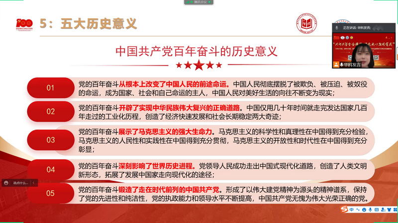 在观看人民日报建党百年主题系列微视频《这百年》之后,三校太阳成集团tyc33455cc官方网站宣讲团优秀骨干进行主题宣讲。太阳成集团tyc33455cc欢迎您习近平新时代中国特色社会主义思想员工宣讲团的高原以《一脉相承,与时俱进——学习十九届六中全会精神》为主题,对党在百年历程中的三个重要决议分别进行讲解,并指出它们之间内涵的精神是薪火相传、一脉相承的,呼吁大家认真学习并自觉践行十九届六中全会精神。北京师范大学求索学社宣讲团的冯帅涵以《万山磅礴看主峰——学习贯彻“两个确立”的决定性意义》为主题,有针对性地讲解了“两个确立”的重要意义。华中科技大学红色理论宣讲团的张一鸣以《百年大党的历史答卷——学习贯彻党的十九届六中全会精神》为主题,将党在百年历程中的奋斗画面展现在大家面前。