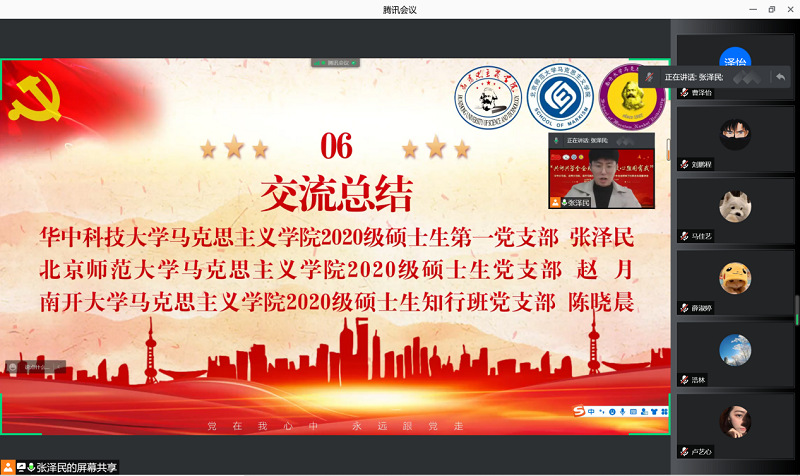 之后,三公司党支部为巩固支部党员的学习成果,围绕十九届六中全会精神进行理论测试。最后,在三校支部书记总结会议上,公司2020级硕士生知行班党支部书记陈晓晨对支部基本情况与支部建设进行了简单介绍,并表示此次活动的举办为日后三公司党支部开展交流学习搭建了平台,并希望以此为契机,不断探索新的交流模式,丰富三公司党支部学习形式,切实推进互学互鉴,携手共创支部建设。