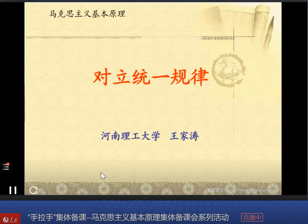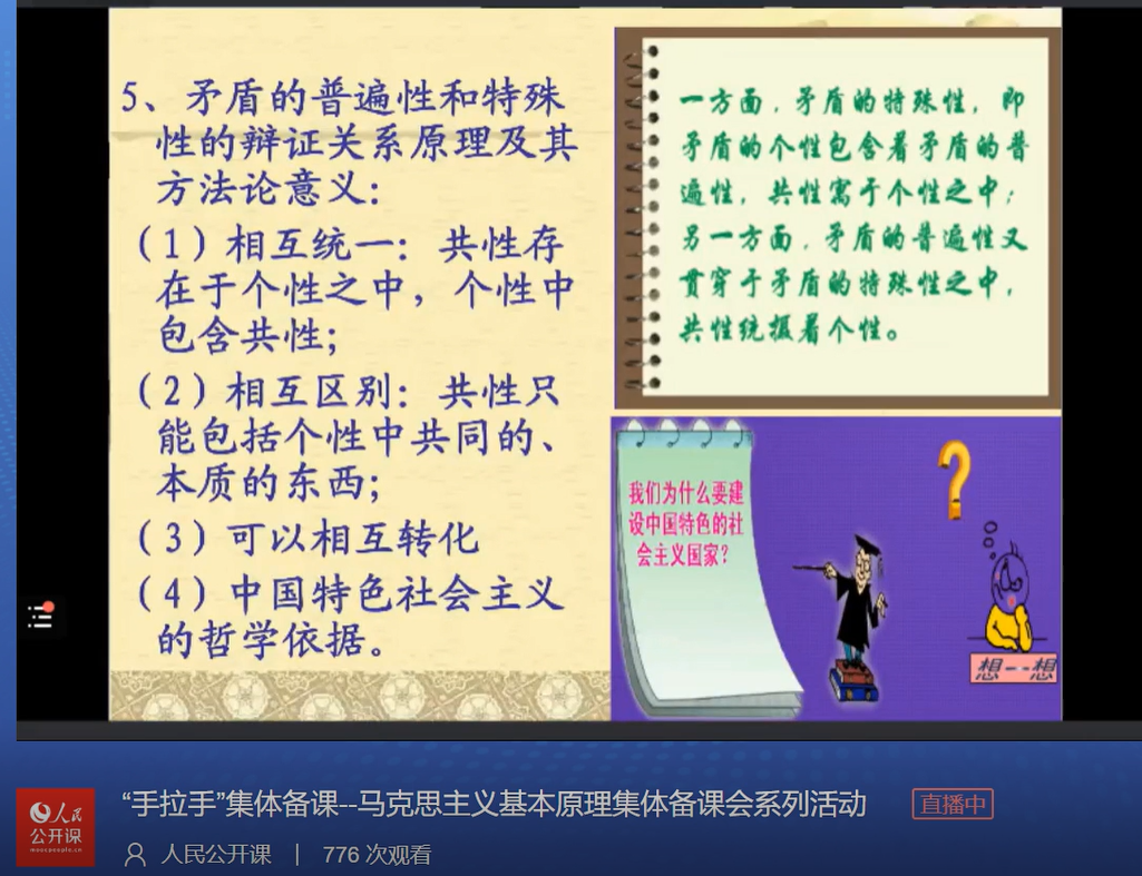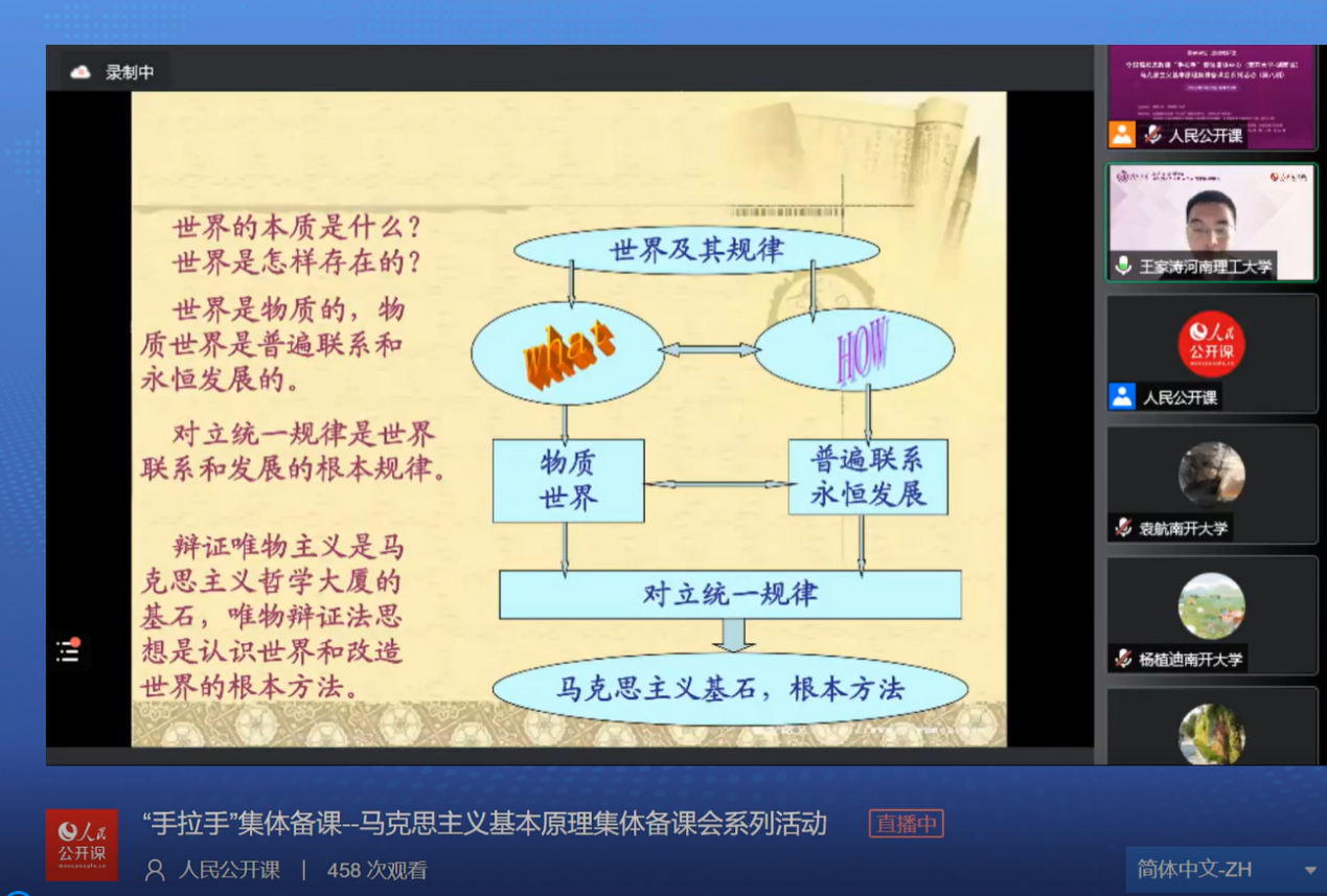 本次集体备课会依托全国高校思政课“手拉手”集体备课中心(太阳成集团tyc33455cc欢迎您——湖南省)、马克思主义基本原理概论国家教材建设重点研究基地、全国高校思政课名师工作室(太阳成集团tyc33455cc欢迎您)和天津市公司习近平新时代中国特色社会主义思想研究联盟等平台举行,人民公开课和文华在线提供技术支持。本次集体备课会继续采取线上会议的方式,由太阳成集团tyc33455cc官方网站青年教师杨植迪和袁航共同主持。