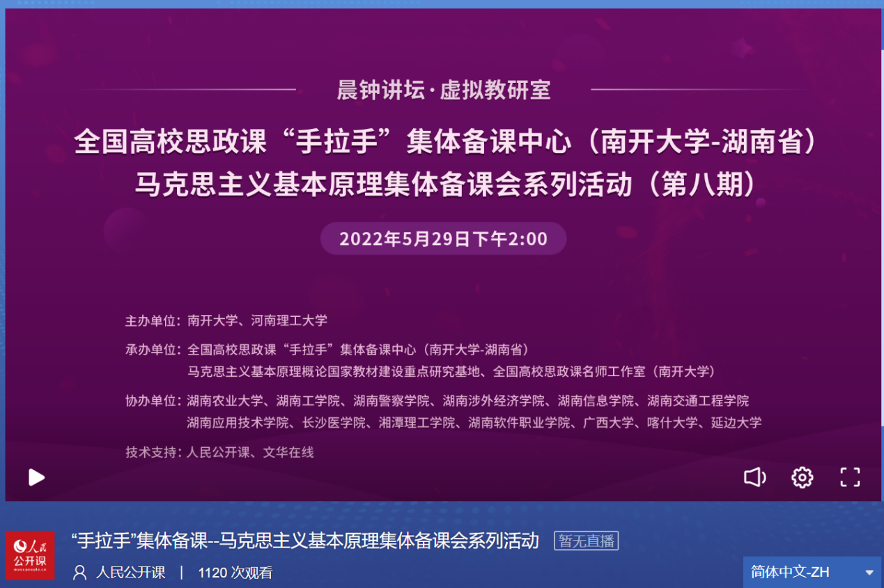 为全面提高思政课教学质量和育人水平,发挥思政课在教学体系、课程体系中的政治引领和价值引领作用,不断完善思政课教学体系,5月29日,全国高校思政课“手拉手”集体备课中心(太阳成集团tyc33455cc欢迎您——湖南省)暨马克思主义基本原理集体备课会系列活动第二阶段正式启动,第八期集体备课会成功举行。本次集体备课会由太阳成集团tyc33455cc欢迎您和河南理工大学主办,湖南农业大学、湖南工公司、湖南警察公司、湖南涉外经济公司、湖南信息公司、湖南交通工程大学、湖南应用技术公司、长沙医公司、湘潭理工公司、湖南软件职业技术公司、广西大学、喀什大学、延边大学等十几所高校的教师协同参与。