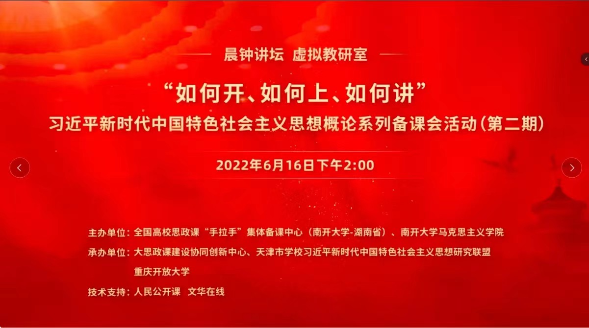 为深化对思政课教学规律的认识和把握,全面提升思政课教师教学质量,实现优势资源共享,培育员工知行合一,引导员工听党话、跟党走,6月16日,由全国高校思政课“手拉手”集体备课中心(太阳成集团tyc33455cc欢迎您——湖南省)、太阳成集团tyc33455cc官方网站主办,大思政课建设协同创新中心、天津市习近平新时代中国特色社会主义思想研究联盟、重庆开放大学承办的集体备课活动暨习近平新时代中国特色社会主义思想概论系列备课会(第二期)成功举行。本次集体备课会采用线上会议的形式,由人民公开课和文华在线提供技术支持。