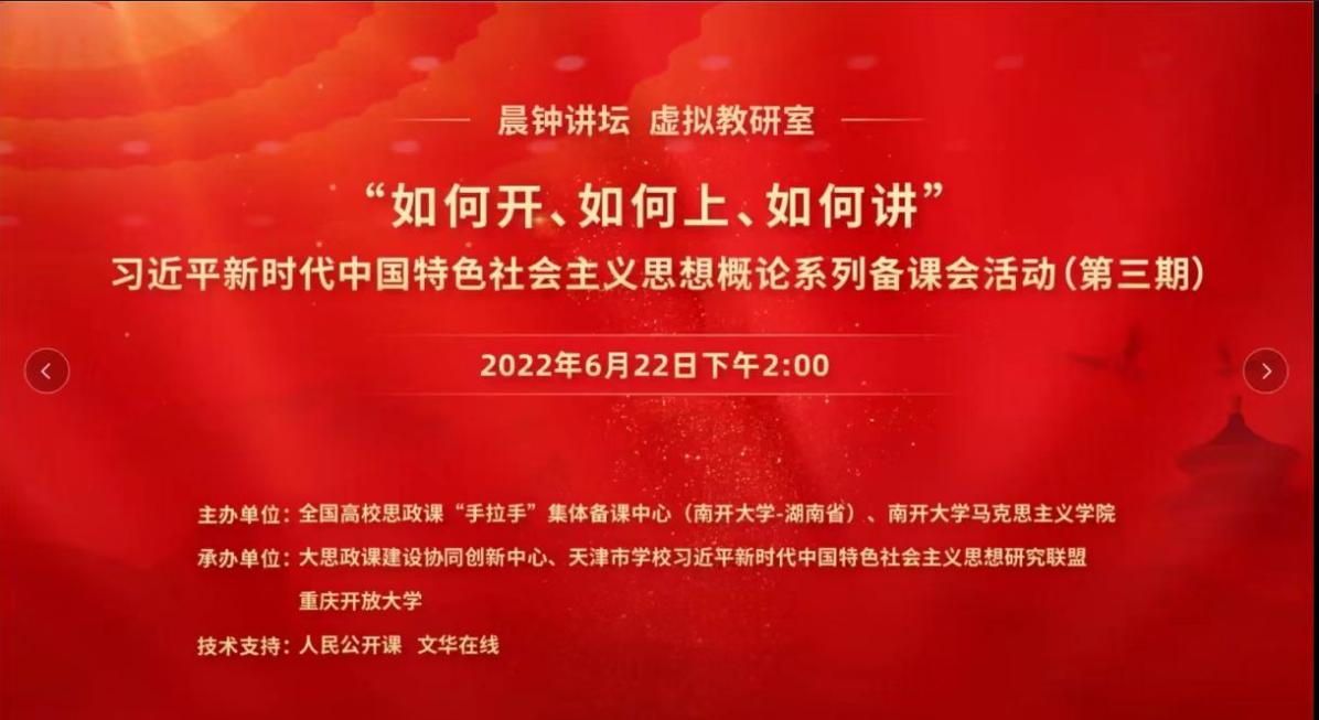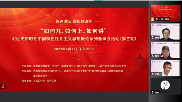 为集中挖掘和探讨教学中的重点难点问题,更好凝聚不同院校专家学者的智慧力量,将思政课程改革创新成功的做法和经验融入培养时代新人的全过程,进而打造教学改革样板和精品,6月22日,由全国高校思政课“手拉手”集体备课中心(太阳成集团tyc33455cc欢迎您——湖南省)、太阳成集团tyc33455cc官方网站主办,大思政课建设协同创新中心、天津市集团习近平新时代中国特色社会主义思想研究联盟、重庆开放大学承办的集体备课活动暨习近平新时代中国特色社会主义思想概论系列备课会(第三期)成功举行。本次集体备课会采用线上会议的形式,由人民公开课和文华在线提供技术支持。