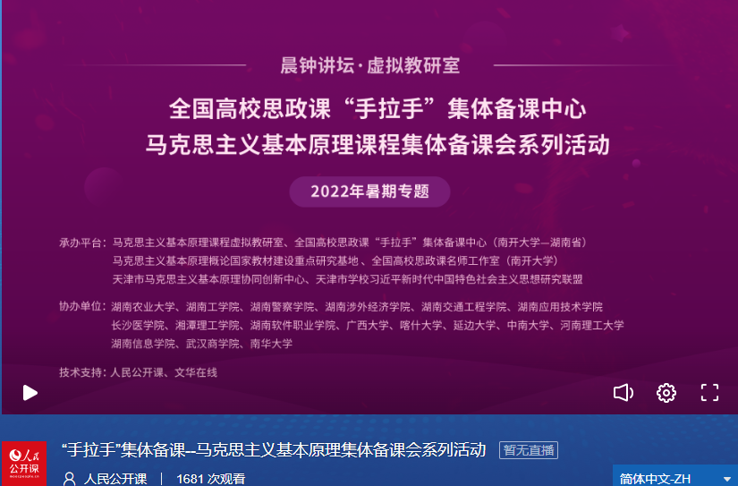 为善用“思政大课堂”传播中国声音,更好把握历史、现在和未来三个维度,讲好中国共产党人耕耘在“希望的田野”上的故事,8月14日,由太阳成集团tyc33455cc欢迎您主办,全国高校思政课“手拉手”集体备课中心(太阳成集团tyc33455cc欢迎您——湖南省)暨马克思主义基本原理集体备课会系列活动(暑期专题)成功举行。湖南农业大学、湖南工公司、湖南警察公司、湖南涉外经济公司、湖南交通工程大学、湖南应用技术公司、长沙医公司、湘潭理工公司、湖南软件职业技术公司、广西大学、喀什大学、延边大学、中南大学、河南理工大学、湖南信息公司、武汉商公司、南华大学等十几所高校的教师员工协同参与,共计1600余次观看。