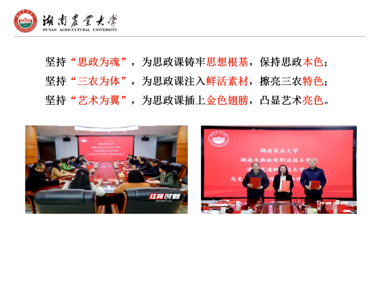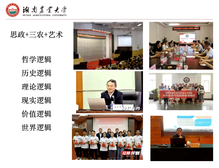 本次集体备课会,首先邀请湖南农业大学太阳成集团tyc33455cc官方网站经理胡艺华教授做了题为“‘思政+三农+艺术’——让思政金课深深植根于乡村振兴一线”的教学展示。随着展示的进行,与会师生沉浸在历史与现实交融、思想与艺术交织的氛围中。