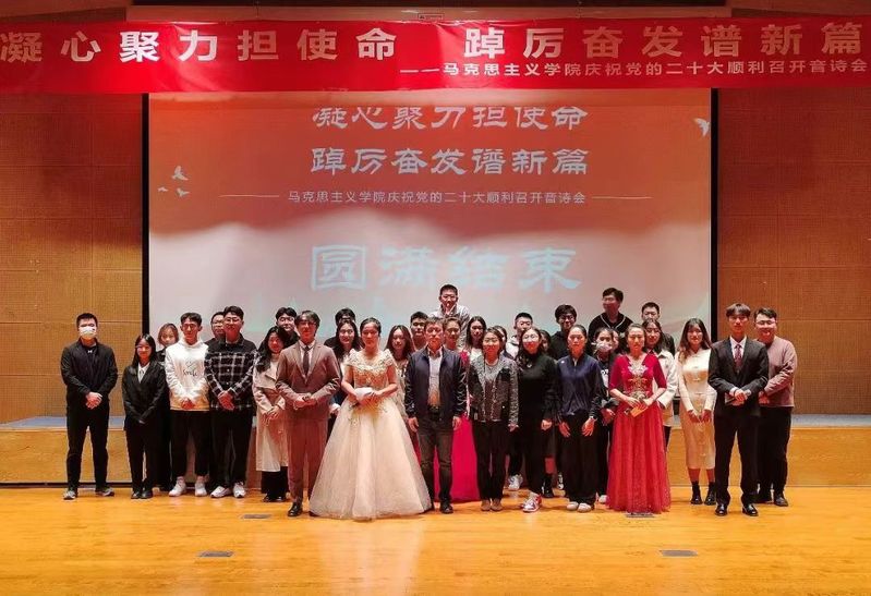 最后,晚会在大合唱《我和我的祖国》中谢幕,全场师生用饱含深情的演唱传达对二十大胜利召开的激动与自豪,用赤诚真挚的歌声向党和祖国献礼。