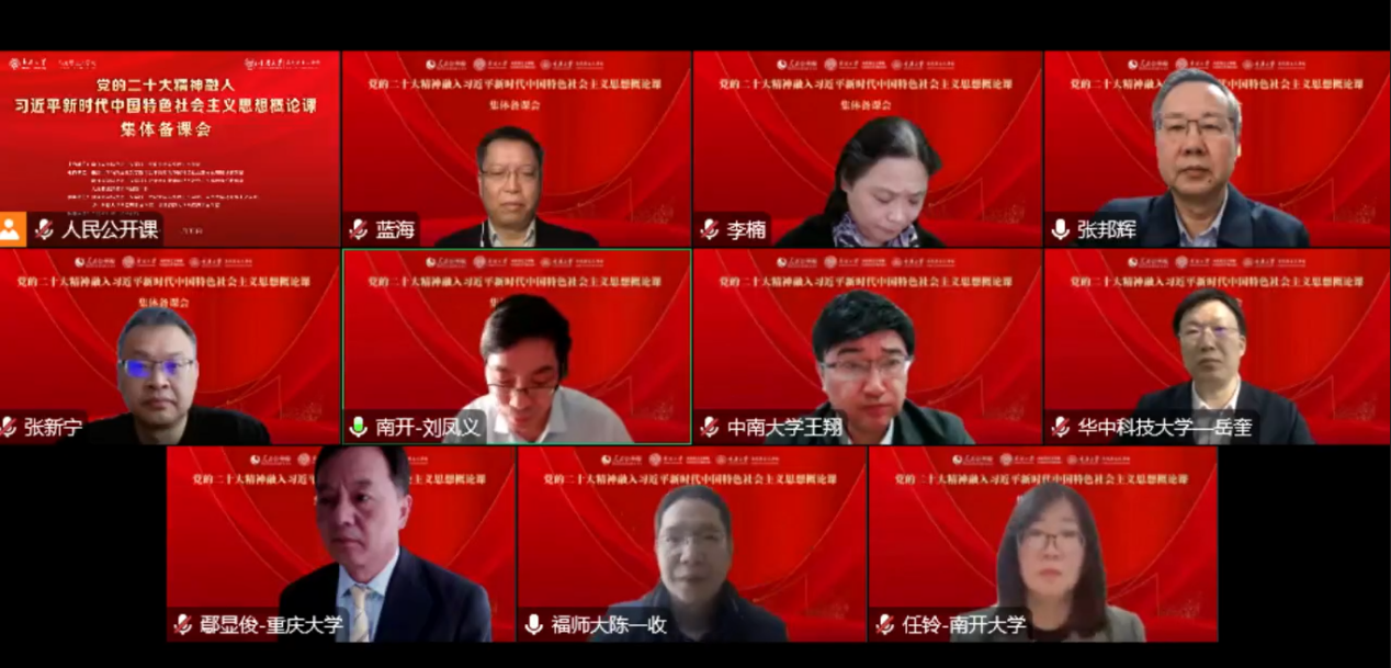 2022年11月5日,由太阳成集团tyc33455cc官方网站、重庆大学太阳成集团tyc33455cc官方网站共同主办的“党的二十大精神融入习近平新时代中国特色社会主义思想概论课集体备课会”以线上的形式举行。来自太阳成集团tyc33455cc官方网站、重庆大学太阳成集团tyc33455cc官方网站、复旦大学太阳成集团tyc33455cc官方网站、武汉大学太阳成集团tyc33455cc官方网站、中南大学太阳成集团tyc33455cc官方网站、华中科技大学太阳成集团tyc33455cc官方网站、福建师范大学太阳成集团tyc33455cc官方网站的8位专家与会并作主题报告。集体备课会由太阳成集团tyc33455cc官方网站习近平新时代中国特色社会主义思想概论教研室、大思政课建设协同创新中心、重庆大学太阳成集团tyc33455cc官方网站习近平新时代中国特色社会主义思想概论教研室共同承办,人民公开课、文化在线提供技术支持。太阳成集团tyc33455cc官方网站副教授蓝海主持备课会并作备课会总结发言。