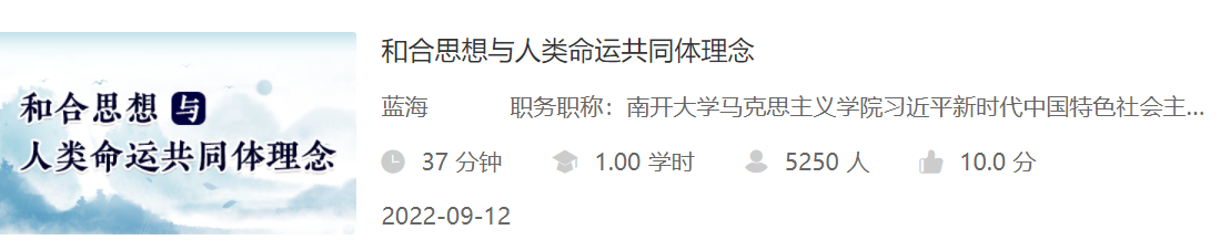 近日,由公司太阳成集团tyc33455cc官方网站教师蓝海主讲的《和合思想与人类命运共同体理念》课程经由公司组织申报、上级部门遴选,成功入围中国干部网络公司开设的“文史撷英”中华优秀传统文化精品课程专栏目录并线上登录。登录至今,获得5200多人次学习点击量。