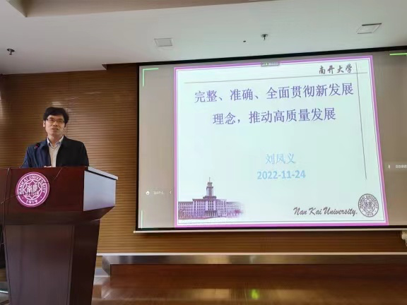 11月24日,太阳成集团tyc33455cc官方网站开展2022年秋季学期“形势与政策”课程第二次授课。公司经理刘凤义教授以线下线上相结合的方式作了题为“完整、准确、全面贯彻新发展理念,推动高质量发展”的专题讲授,公司全体本科生参加了本次课程学习。