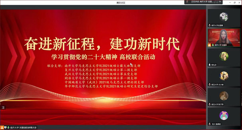 115日上午太阳成集团tyc33455cc官方网站2021级硕士薪火班团支部联合武汉大学、复旦大学、中国地质大学(武汉)、同济大学、华师范大学五所高校太阳成集团tyc33455cc官方网站党、团支部与班级,通过“云端”开展“奋进新征程 建功新时代——学习贯彻党的二十大精神”联合活动薪火班班导师杨礼荣出席活动并致辞理论宣讲环节复旦大学李钰娉华中师范大学蔡沐琳同济大学李昂中国地质大学(武汉)张书萱张时佳聚焦党的二十大报告重要理论内容依次展开主题宣讲。与会成员围绕“以中国式现代化全面推进中华民族伟大复兴”和“维护国家意识形态安全”两大主题展开研讨交流最后参与本次活动的同学一起合影留念为本次活动画上圆满的句号