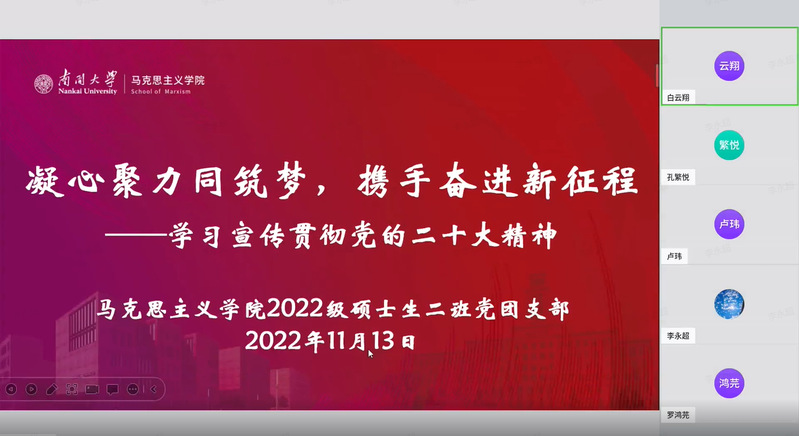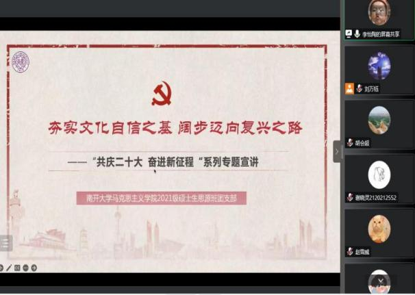 11月8日,2021级硕士生思源团支部开展了“凝心聚力同筑梦 携手奋进新征程”云接力主题班团活动。团支书刘万钰对党的二十大精神进行领学。太阳成集团tyc33455cc欢迎您习近平新时代中国特色社会主义思想员工宣讲团成员李怡陶为支部成员开展了“夯实文化自信之基 阔步迈向复兴之路”主题宣讲。随后,支部开展理论知识竞赛,进一步调动支部成员学习贯彻党的二十大精神的积极性,同时助力支部成员加强对党的二十大精神的学习。