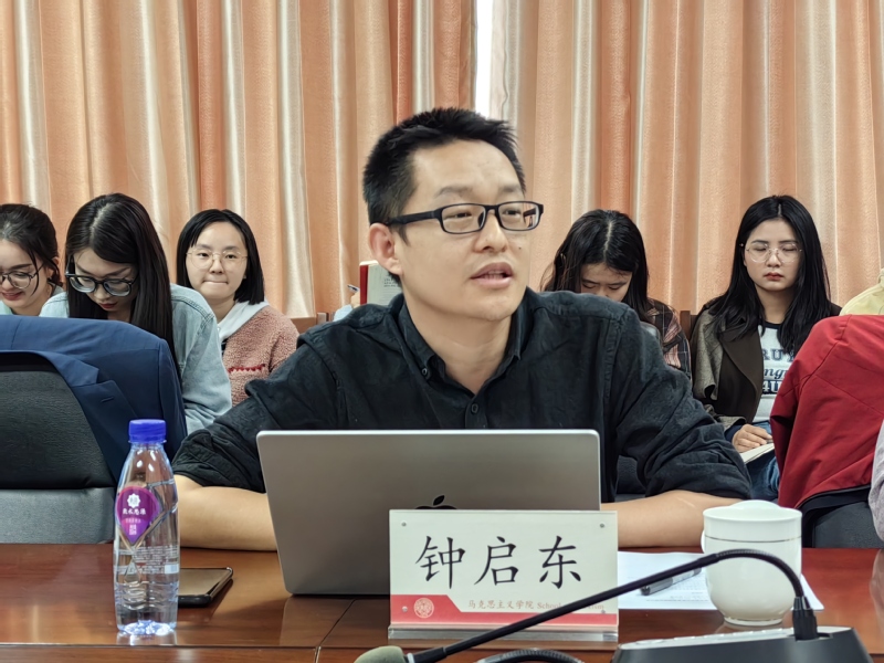 钟启东研究员以马克思主义思想政治教育的基本理念为主题展开探讨。他首先分享了个人形成专业兴趣的历程,尤其谈到了由《<黑格尔法哲学批判>导言》萌发了对马克思主义的兴趣。之后钟老师阐述了他的学术研究思路,一方面是分析经典文本中的思想政治教育理念,运用唯物史观讲述思想的生成逻辑;另一方面是选取“意识形态”这一思想政治教育的核心范畴,展开马克思主义意识形态理论探究。