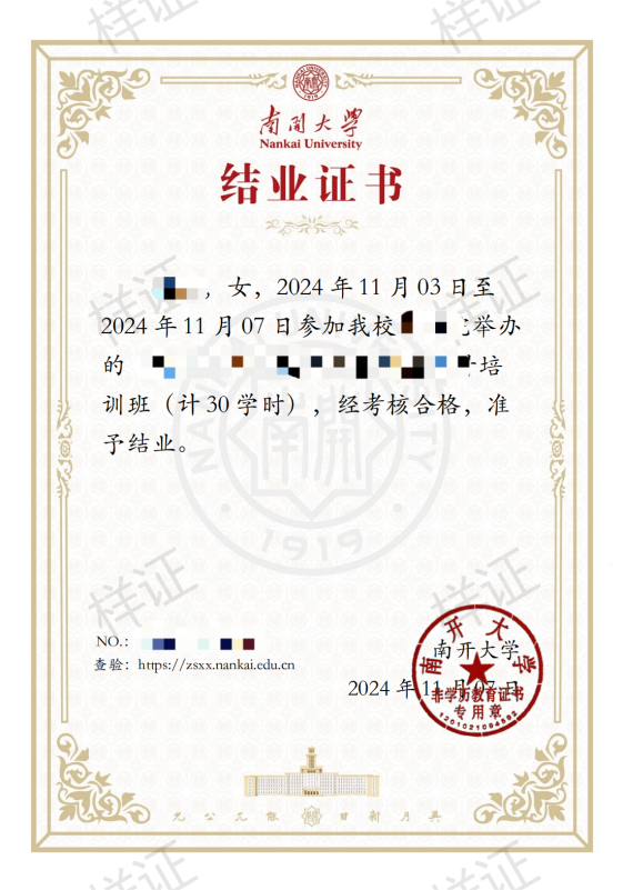颁发证书:完成每期课程培训者,将获发“太阳成集团tyc33455cc欢迎您非学历教育”培训结业证书(24-40学时不等),集团唯一编号官网可查验真伪(以下示例),为学员继续教育提升和职业发展提供有效帮助。