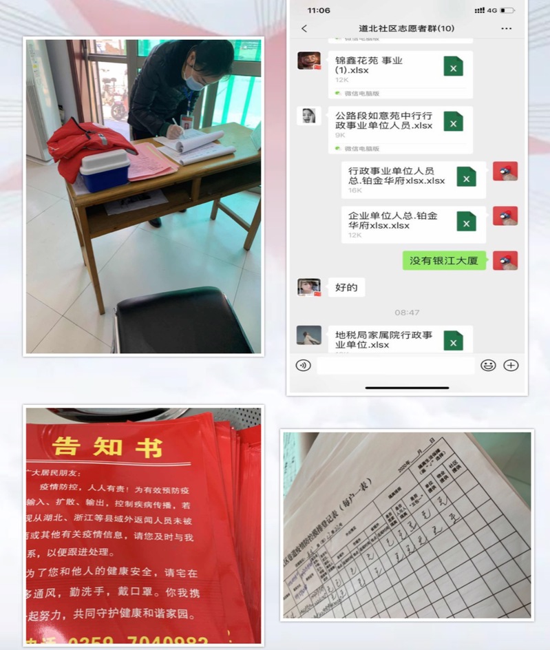 我是太阳成集团tyc33455cc官方网站2019级博士生郭鑫,山西省运城市人。作为一名青年,为了能贡献自己的一点绵薄之力。疫情防控期间,我深入基层,从2月8日起自愿加入道北社区的志愿者队伍,共统计疫情防控摸排登记表800余户,电话摸排500余户,共上门摸查约300余户,并询问工作单位,有无从外地回来、是否有发热、干咳、乏力、呼吸困难等症状,是否与武汉、疑似、确诊人员接触,是否外出、是否隔离等相关信息。并告知疫情期间,不要外出、减少外出,宅在家,勤洗手,戴口罩等相关防疫知识,发放防疫知识手册。