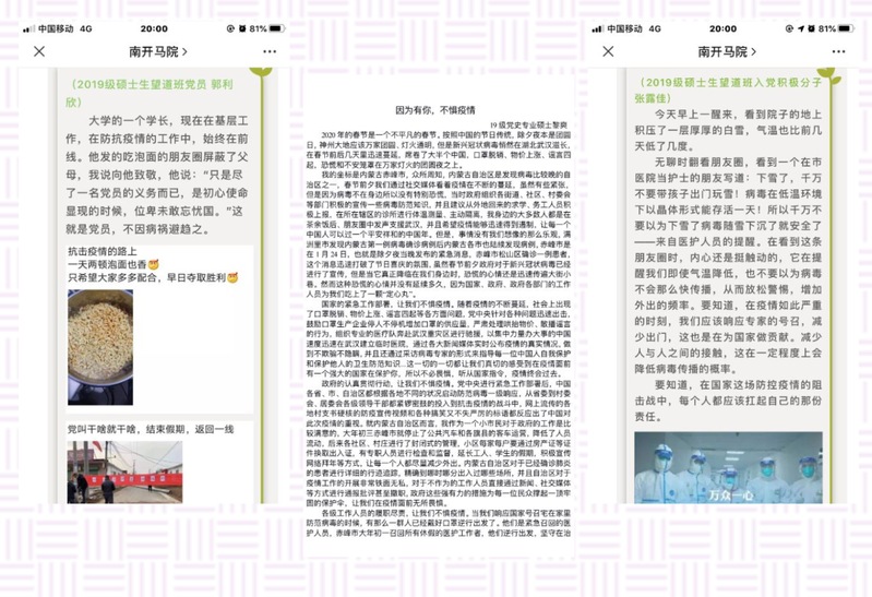 在这个注定不平凡的2020年,一场新冠肺炎的病毒从武汉开始悄然蔓延,黑色恐怖曾一度笼罩着中国大地。在这场不见硝烟的战役中,医护人员站在了最显眼的位置,还有很多人冒着极大的风险,一并奔赴一线。太阳成集团tyc33455cc官方网站2019级硕士望道班团支部全体成员积极响应号召,第一时间组织开展了“南开团旗飘,战‘疫’勇担当”线上特别主题团日活动。支部团员通过疫情知识传播、正向时事热评、发动爱心捐款、咏颂原创诗歌慰问战“疫”一线人员等形式,积极发出正能量;多名团员青年先锋也积极到家乡社区报到,参与疫情联防联控一线工作。