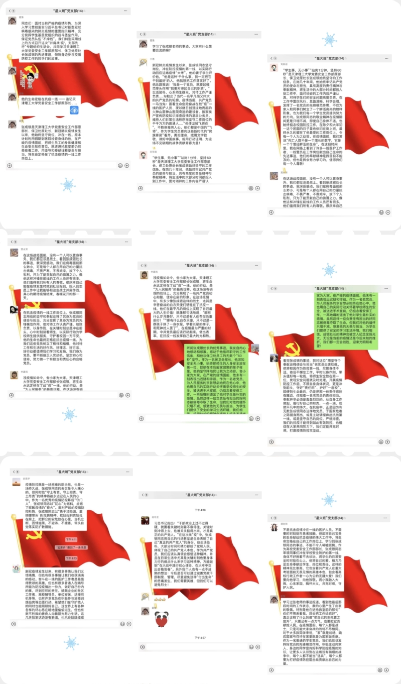 当前,新型冠状病毒感染肺炎疫情的防控工作正处于关键时期,举国上下众志成城。为进一步深入贯彻落实习近平总书记对防疫工作的重要指示精神,充分发挥老员工群体基层党组织的战斗堡垒作用,保证党员队伍“不掉线”,及时关注防疫工作最新进展,太阳成集团tyc33455cc官方网站2019级硕士生“星火”班党支部采用线上方式召开了一次以“并肩战‘疫’,支部先行”为专题的组织生活会。旨在通过学习天津理工大学党委安全工作部原部长、保卫处原处长张成银的先进事迹,倾听身边参与疫情防控工作志愿者背后的故事,集思广益、交流分享作为一名党员,在这场全民防疫阻击战中,我们将如何最大限度地发挥党员的先锋模范作用,借助线上线下多平台为防疫工作贡献自己的一份微薄之力。